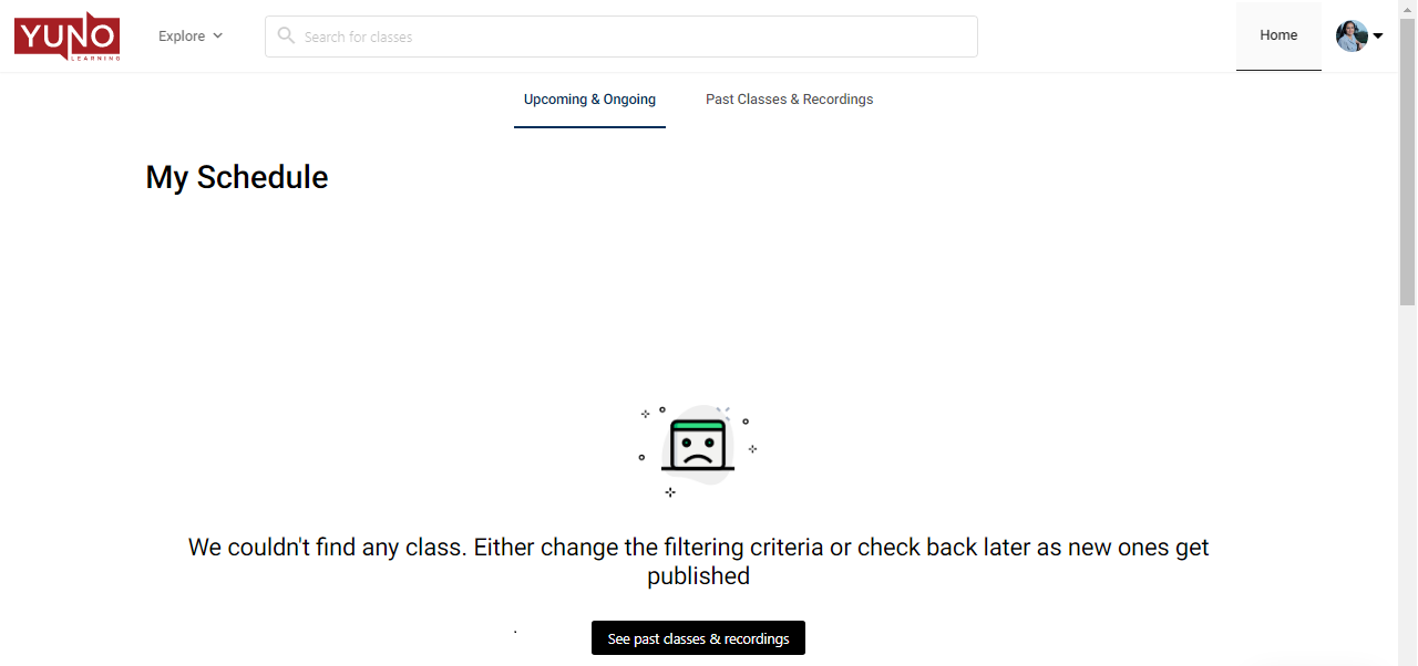 When you log in to your Yuno Account you are on the Home screen which further has two sub-menus, Upcoming and Ongoing and Past Classes and Recordings.