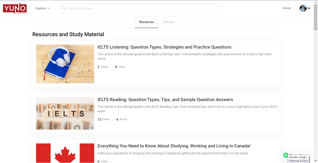 On clicking the Explore tab, all the course categories that Yuno offers show up. Now, each course category has its own resources which could be of the type Videos, eBooks, Quizzes, Notes, or Articles.