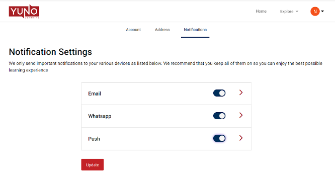 To receive email and WhatsApp notifications of your scheduled classes make sure your notification settings are turned on.