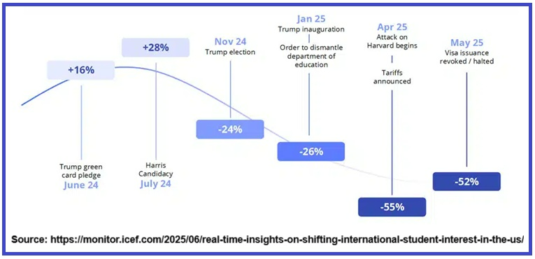 An article in the New York Times of August 14, 2025, reports a marked decline in international student interest in American programmes. Citing searches on major international education search platforms and anecdotal evidence from American university administrators, the writers attribute the decline to government suspicion of international students under the Trump regime.