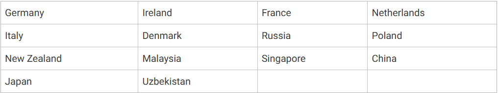 | 6. | Poland Denmark China Japan Malaysia Uzbekistan |
