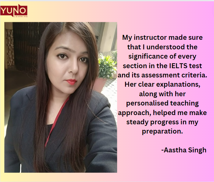 Astha decided to join Yuno Learning’s IELTS Comprehensive Course, where she was guided by instructor Kashish Lulania. Kashish played a key role in breaking down the exam pattern. She made sure that Astha understood the significance of every section in the IELTS test and its assessment criteria. Her clear explanations, along with her personalised teaching approach, helped Astha make steady progress in her preparation. In addition, The one-on-one sessions and detailed feedback allowed Astha to pinpoint her weak areas and work on them effectively.
