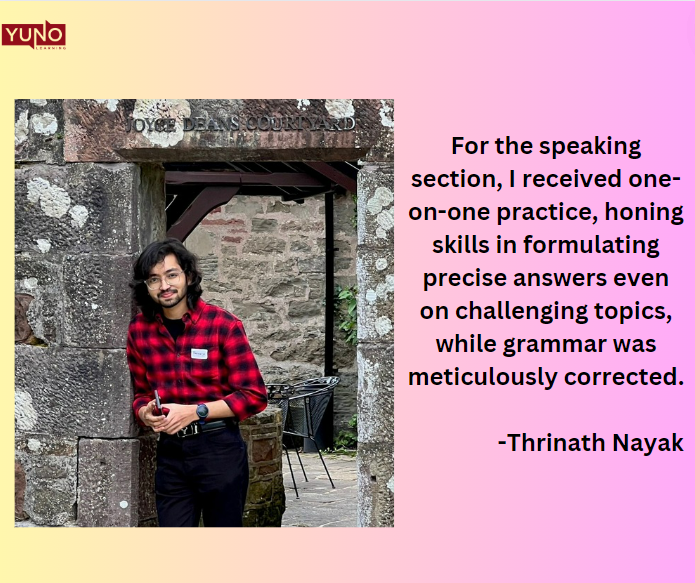 Thrinath’s feedback highlighted the excellence of his IELTS training experience. He lauded Rahul Sir’s patient teaching approach, customized attention, and positive impact on his learning journey. Thrinath expressed his gratitude for the exceptional IELTS training received at Yuno Learning.