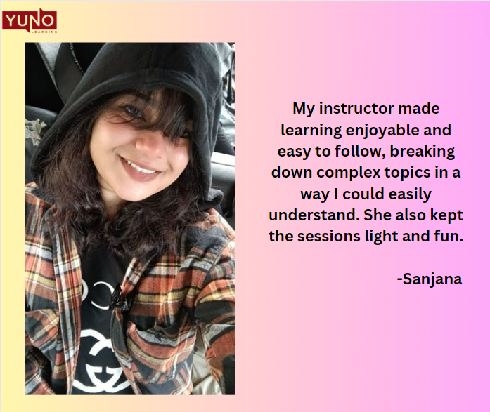 Sanjana joined Yuno Learning’s IELTS Comprehensive Course and found immediate support from her instructor, Deepshikha. Deepshikha made learning enjoyable and easy to follow, breaking down complex topics in a way that Sanjana could easily understand. She also kept the sessions light and fun, which helped Sanjana stay focused and motivated throughout her preparation.