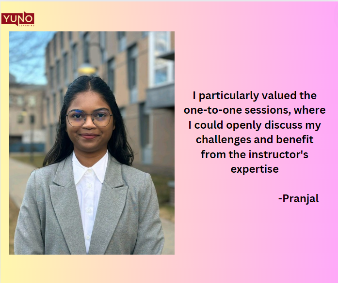 Turning to UpGrad for assistance, Pranjal discovered their partnership with Yuno Learning, renowned for its quality IELTS preparation courses. Recognizing the opportunity, she promptly enrolled in Yuno’s comprehensive live online classes. During his initial counseling session with Yuno Learning, Pranjal’s quick learning abilities were acknowledged.