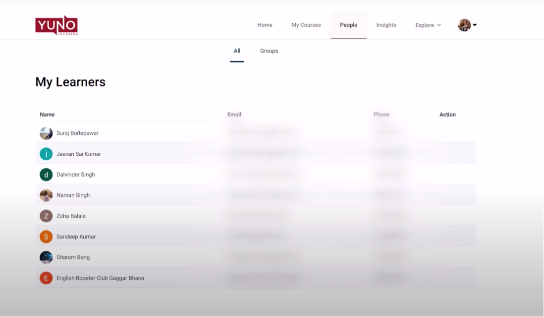 Under All, you see the names, email ids and phone numbers of all of your learners (in case you need to connect with any of your learners).
