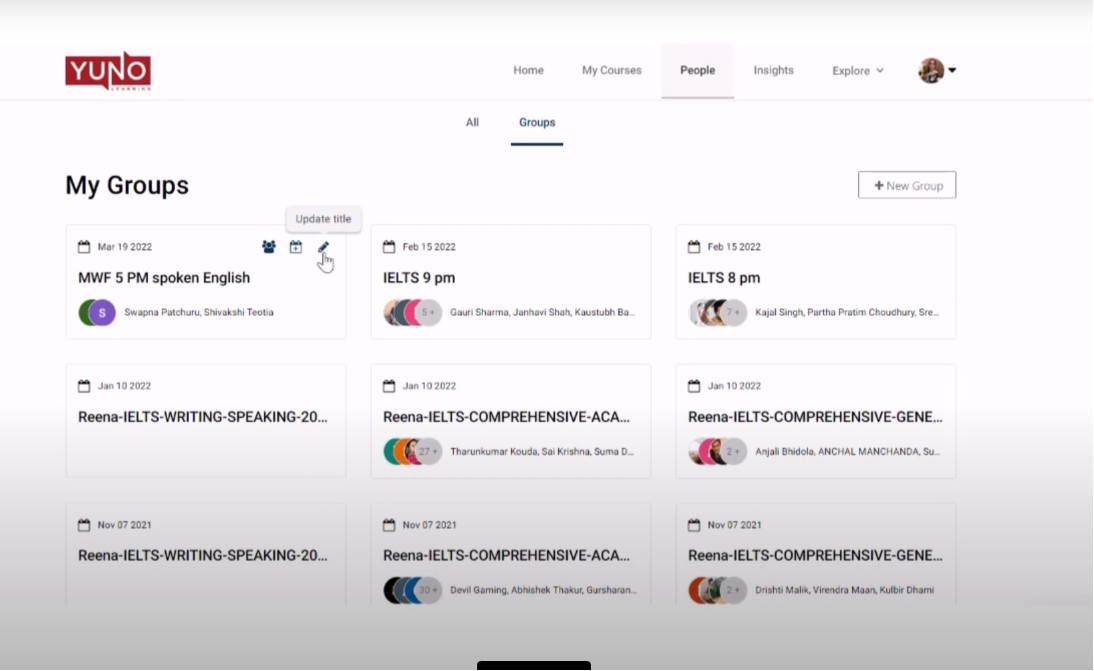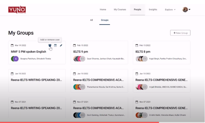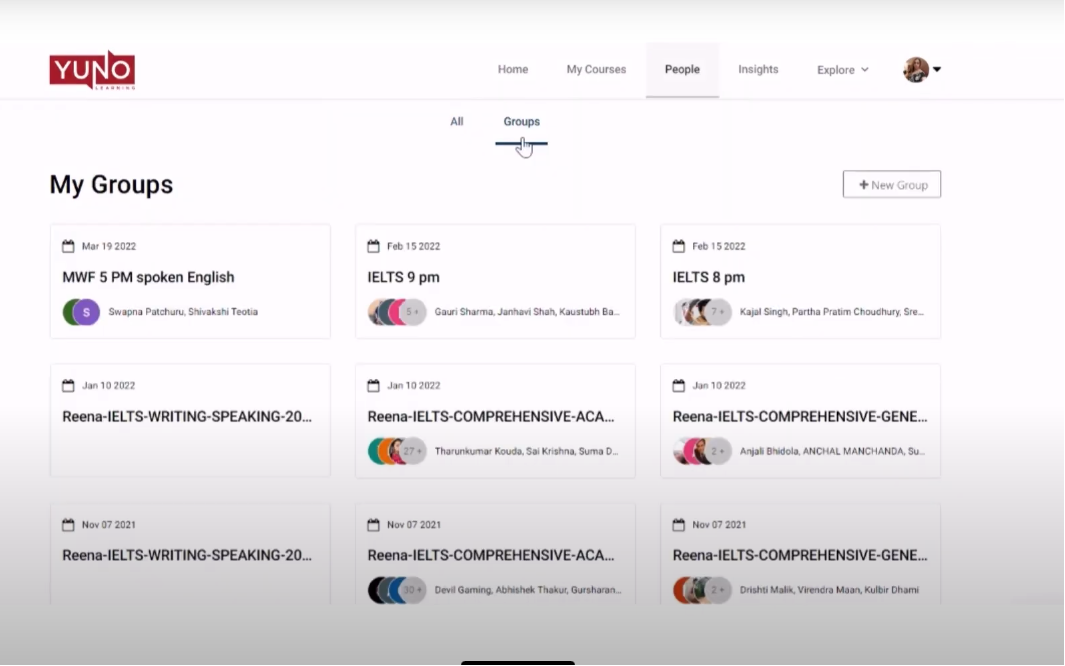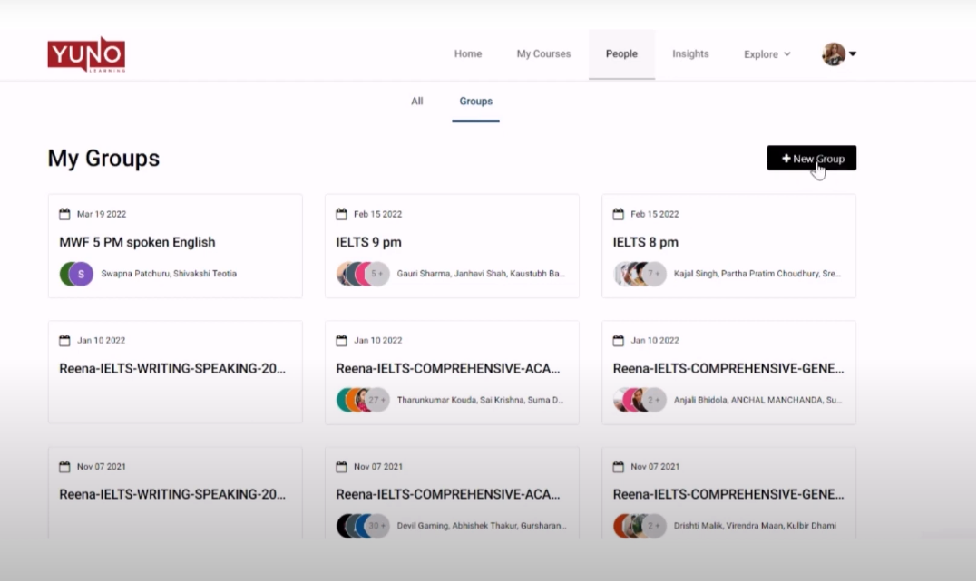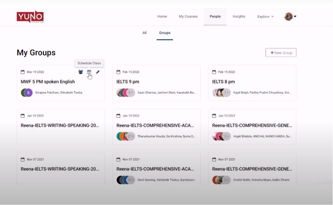 Groups help you perform some tasks on Yuno faster. For instance, when you schedule a class, you can schedule it for an entire group instead of adding learners individually.