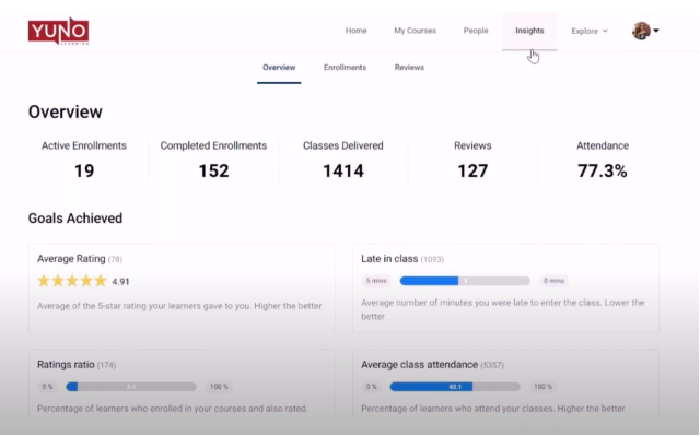 You’ll see 5 key data metrics: Active Enrollments, Completed Enrollments, Classes Delivered, Reviews and Attendance.