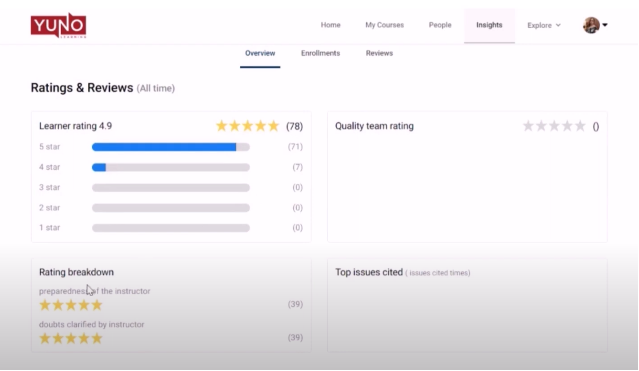Within the Insights tab, you’ll see 3 different tabs – Overview, Enrollments and Reviews.