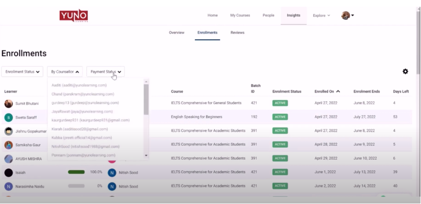 In the Enrollments tab, you’ll see the batch details of all of your Active Learners. You can use various filter options to filter out the records you want to view.