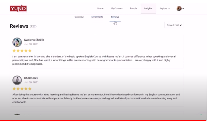 Reviews tab contains all the reviews given by your learners.