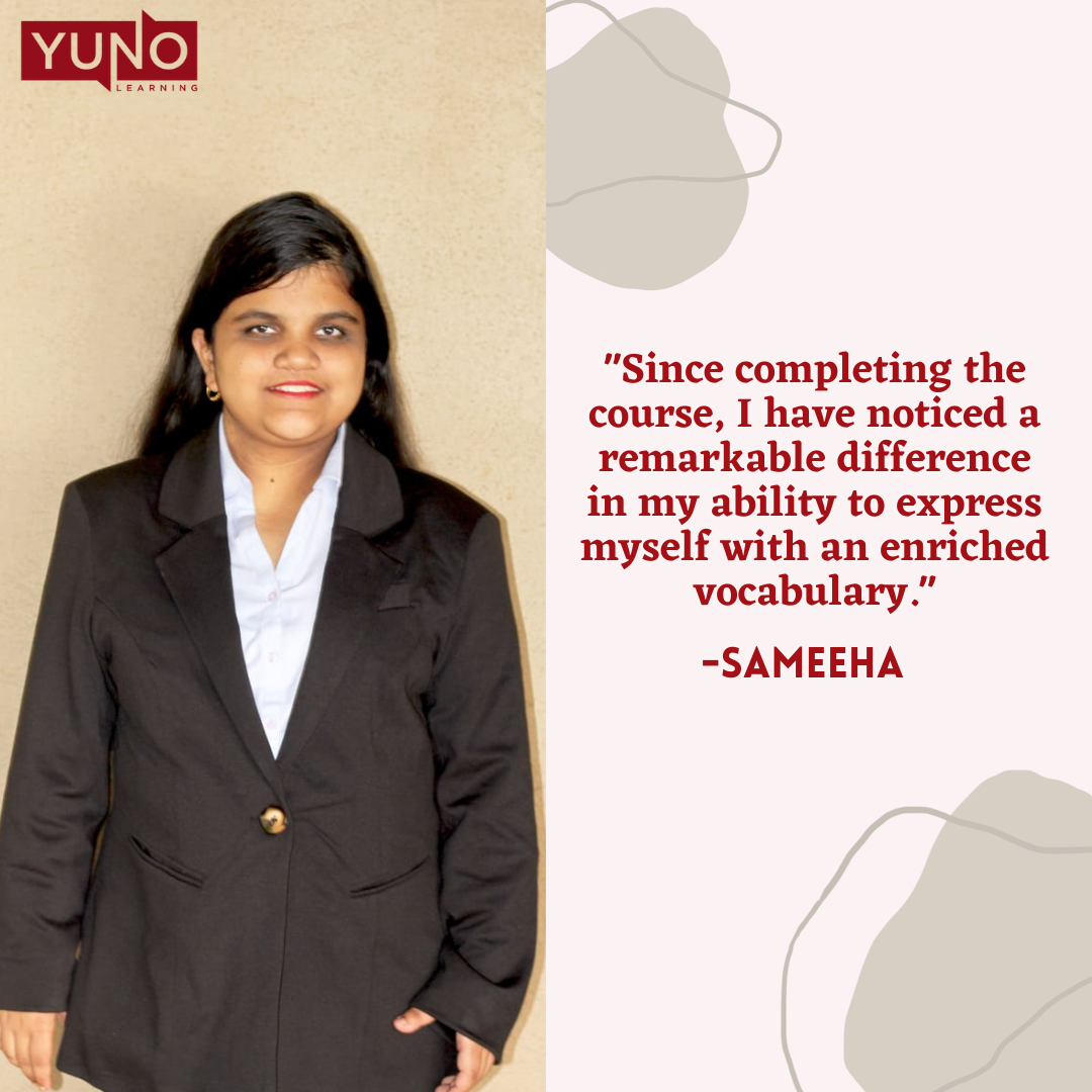 This case study highlights Sameeha’s journey to enhance her English speaking skills through Yuno Learning’s program. It showcases her progress, increased confidence, and improved abilities in expressing herself professionally.